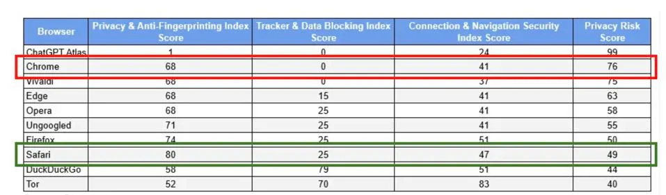 Браузер Google Chrome посів передостаннє місце у рейтингу, набравши 76 балів зі 100, де вища оцінка означає вищий ризик для користувача. Гірші показники мав лише експериментальний браузер Atlas, створений у зв’язку з платформою ChatGPT.