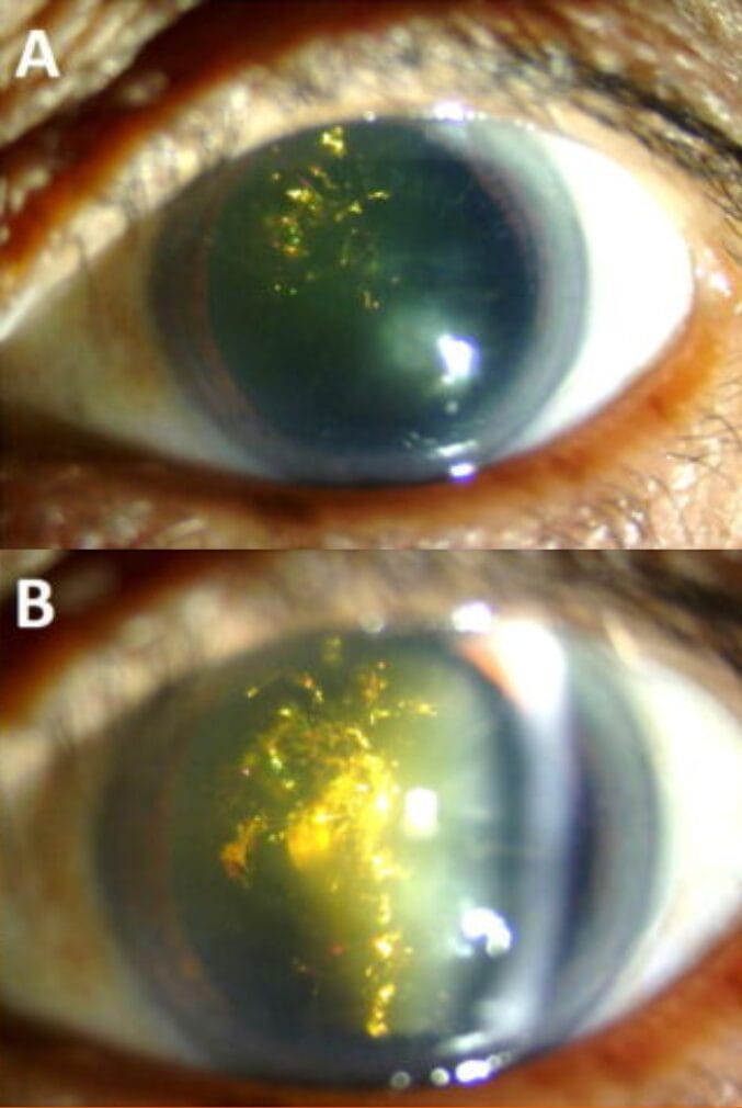 Інше дослідження, опубліковане в Saudi Journal of Ophthalmology у 2016 році, документує подібний випадок у 60-річної жінки. Під час огляду в оці спостерігали кристали, що пронизували всі напрямки кришталика та переливалися в промені світла.