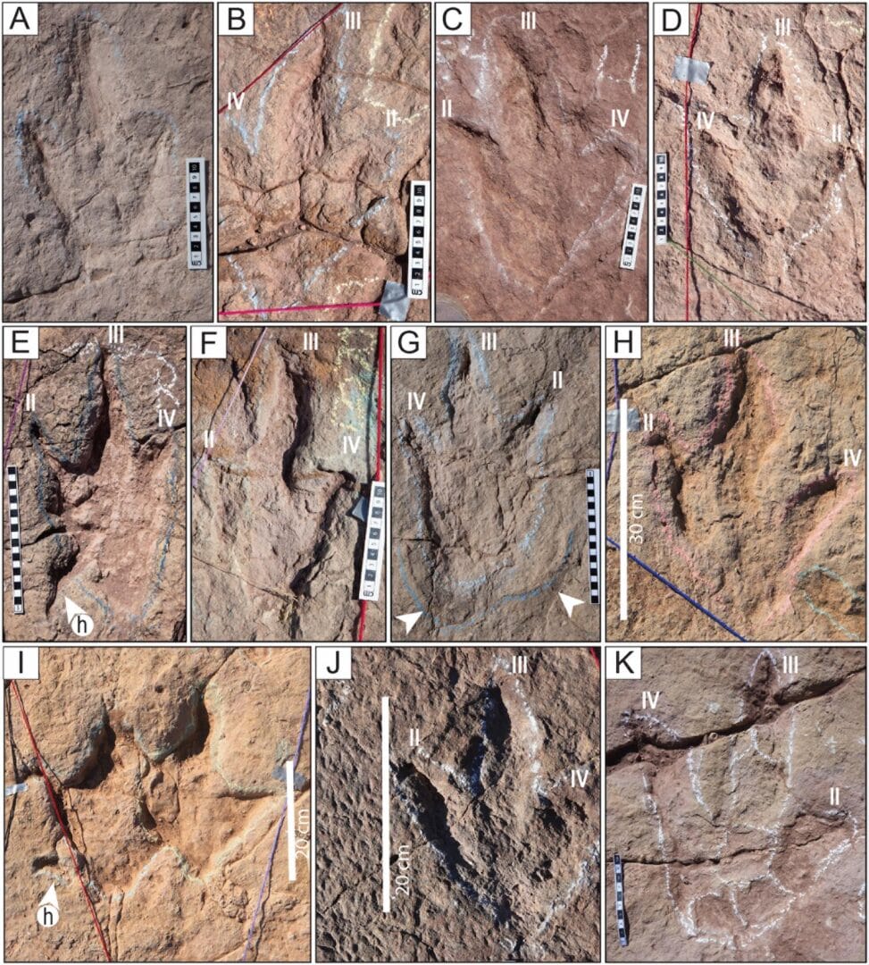Усього виявлено 1321 доріжку з трьохпальцями слідами, 289 поодиноких відбитків і 1378 слідів плавальних рухів, які залишили тероподи. Тероподи — це група двоногих хижих динозаврів, до якої належать тиранозаври, велоцираптори, а також предки сучасних птахів.