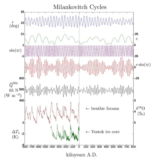 Клімат Землі змінюється впродовж мільйонів років. Періоди потепління чергуються з льодовиковими фазами. Ці зміни частково пояснюються так званими циклами Міланковича — довготривалими варіаціями параметрів орбіти Землі та її осі обертання. Вони включають: