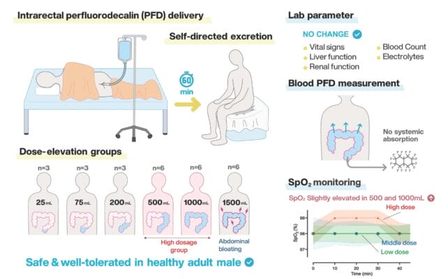Дослідження проводилося в Японії, де в експерименті взяли участь 27 здорових чоловіків-добровольців. Учасникам вводили в пряму кишку від 25 до 1500 мл перфторвуглецевої рідини, яка, утім, не містила кисню — це дозволило сфокусуватися лише на оцінці безпечності процедури.